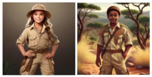 Girls and Boys: Tan safari wear with pith or explorer-type hat.