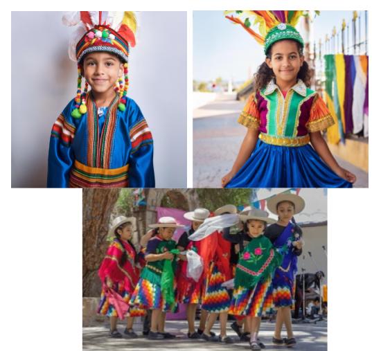 Boys: Bright colors with a pancho or scarf and a hat. You may get creative and add some feathers to the hat.